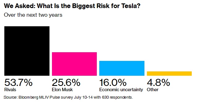 Pulse)调查显示,54%的受访者认为行业竞争风险加剧对特斯拉构成了最大的挑战,26%的受访者则指出反复无常的首席执行官的行为和决策是特斯拉投资者的主要担忧。