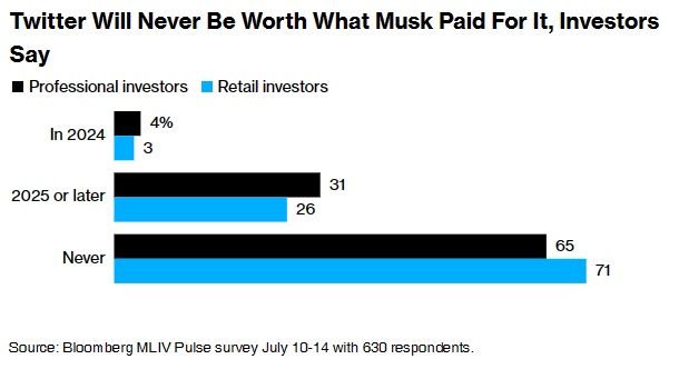 在被马斯克收购之后,推特的价值也开始缩水。约67%的受访者表示,他们预计推特的价值将永远不会恢复到马斯克收购时的水平。