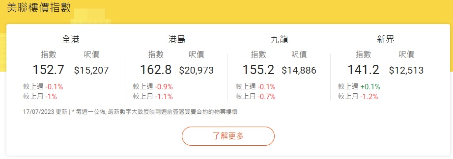 智通财经APP获悉,7月17日,根据香港美联物业官网显示,美联香港楼价指数最新报152.66点,按周跌0.12%,连跌3星期,较年内高位跌约1.7%;较四星期前则跌0.99%;而本年至今升4.53%。