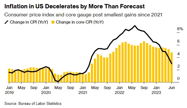 推动股债两市上涨的主要因素是上月通胀大幅下降。美国劳工部7月12日报告称,6月份消费者价格指数(CPI)较上年同期上涨3%,低于5月份的4%。这是超过24个月以来的最小增幅,远低于一年前9.1%的增幅。