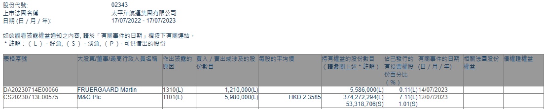 Plc增持太平洋航运(02343)598万股,每股作价2.3585港元,总金额约为1410.38万港元。增持后最新持股数目约为3.74亿股,最新持股比例为7.11%。