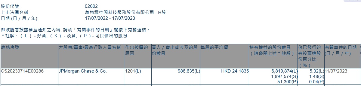 智通财经APP获悉,香港联交所最新资料显示,7月11日,小摩减持万物云(02602)98.6635万股,每股作价24.1835港元,总金额约为2386.03万港元。减持后最新持股数目为681.99万股,最新持股比例为5.32%。