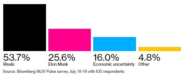 Pulse调查的受访者认为,随着埃隆•马斯克似乎被他的高调事业(从社交媒体、太空旅行到人工智能)分散了注意力,其他汽车制造商纷纷抓住市场对电动汽车蓬勃发展的需求,这将是特斯拉(TSLA.US)未来两年面临的最大挑战。