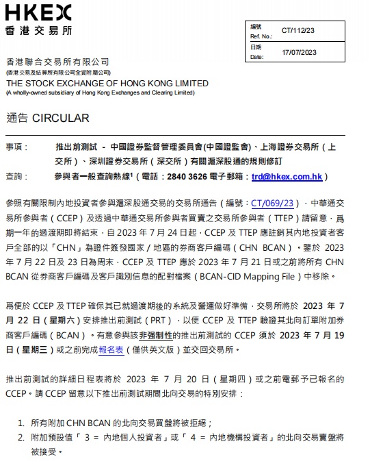 智通财经APP获悉,7月17日,香港交易所发布公告,将于7月22日安排有关限制内地投资者参与沪深股通交易推出前测试(PRT),以便中华通交易所参与者(CCEP)及透过中华通交易所参与者买卖的交易所参与者(TTEP)验证其北向订单附加券商客户编码(BCAN)。