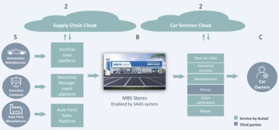 因此,公司采用S2B2C的商业模式构建了汽车供应与服务链云平台,汽车制造商、汽车零部件制造商、保险公司作为“供应商”,MBS门店作为“商家”,车主作为“商家”,而中驰车福自身扮演中间连接的身份,将上述几方串联起来,实现汽车供应链和服务链各交易主体之间的流程同步和优化,服务于商品采购、订购和付款、库存控制、物流和履行管理等环节,从而获得收益。
