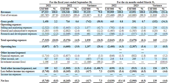 而从2023上半财年(截至2023年3月31日)来看,公司实现收入4395.1万美元,同比下降21.38%,期内净亏损约290万美元,好消息是亏损较上年的303.9万美元已有所收窄。但从整体来看,其收入的波动较大,亏损的收窄一时难说是不是暂时的。