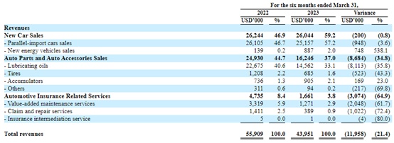 而从业务结构上看来,公司的收入主要来源于新车销售和配件销售。新车销售业务虽然起步稍晚,却已经是公司收入的“顶梁柱”。其中,平行进口车带来的营收占比超过总营收的50%,2023上半财年内贡献2515.7万美元;其次,中驰车福的传统业务汽车零配件销售期内亦贡献了1624.6万美元,而汽车保险相关业务仅实现166.1万美元收入。