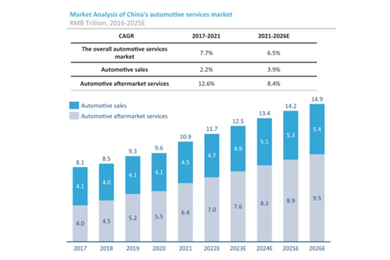 站在当下时点,随着汽车保有量的持续增长,中国汽车后市场已经成为仅次于美国的全球第二大市场。随着平均车龄的不断增加,中国汽车后市场迎来了发展的黄金时期。弗若斯特沙利文预计,到2026年,中国汽车服务市场规模将达到2.3万亿美元,复合年增长率为6.6%。
