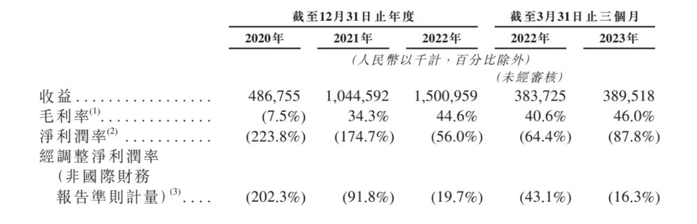 期间内,公司毛利率同比快速提升,由2020年的毛损率7.5%转正为2021年的毛利率34.3%,并上升至2022年的44.6%,截至2023年3月31日止三个月达到46.0%。