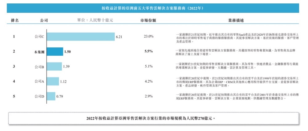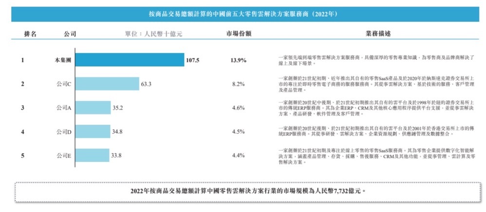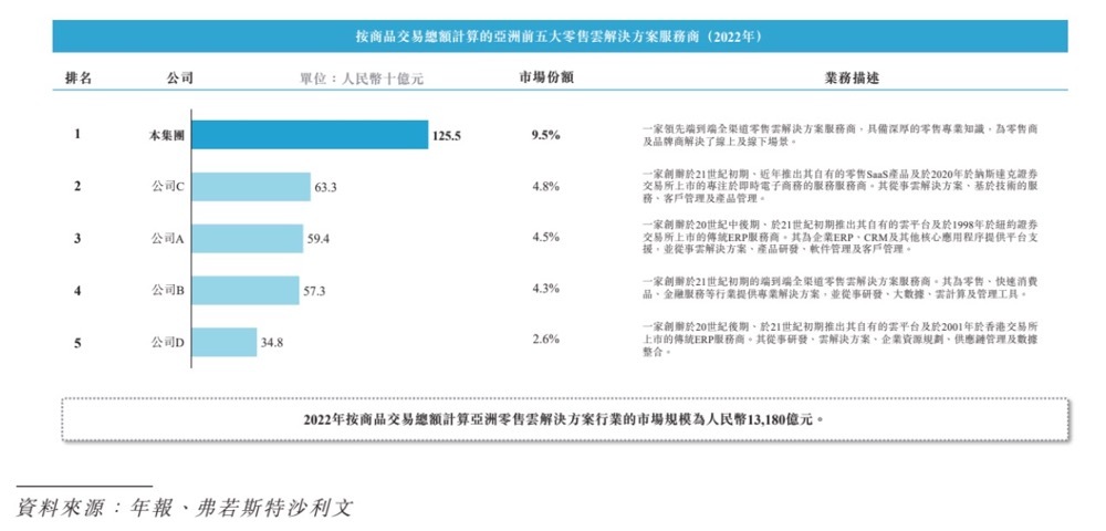 从行业格局而言,根据弗若斯特沙利文的资料,按商品交易总额计算,多点数智是2022年中国内地最大的零售云解决方案服务商及中国领先的端到端零售云解决方案服务商,同时也是2022年亚洲最大的零售云解决方案服务商。