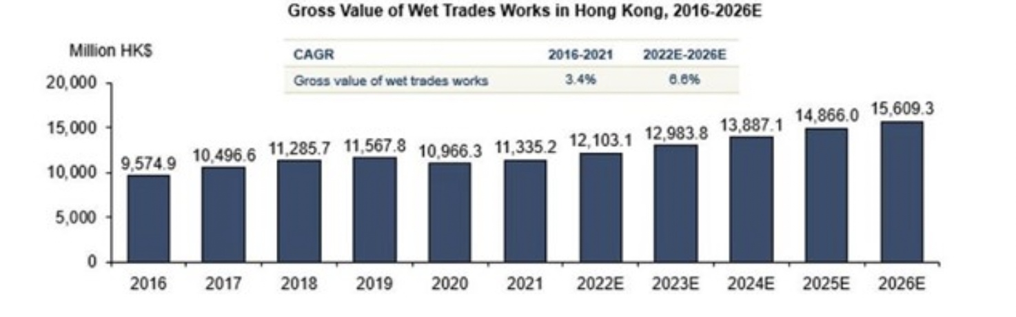 正如《2021年施政报告》所述,政府的目标是在未来数年增加过渡房屋的整体供应,而“北部都会发展策略”的推出,有助新市镇、新发展区和发展节点的增长。加上其他支持性政府政策以及城市更新的加快,香港泥水工程的总价值预计将从2022年的121.03亿港元增加到2026年的约156.09亿港元,期间复合年增长将提升至6.6%。