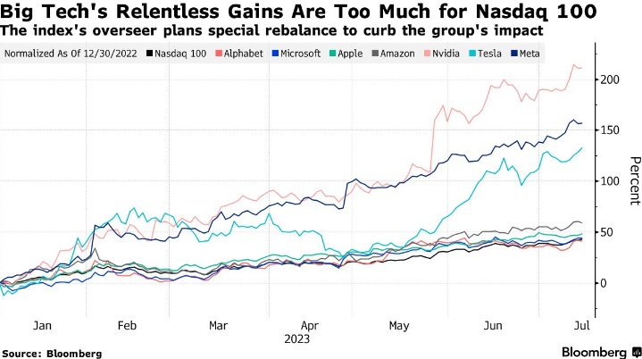 预测大型股的实际新权重仍然是一件棘手的事情,因为它们的市值将每天变化,直到下周一再平衡生效。纳斯达克的一位发言人表示,以7月3日为基准日,七大成分股的总持股比例将从55.1%降至43.7%。