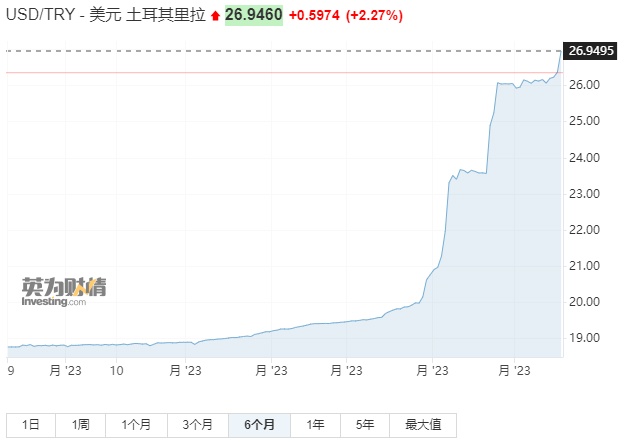 智通财经APP获悉,周二,土耳其里拉兑美元汇率下跌逾2%,创下历史新低,原因是市场担心土耳其央行本周加息的幅度可能低于此前的预期。里拉兑美元触及26.9的纪录低点,较周一收盘的26.3505下滑。今年到目前为止,里拉已经贬值了30%。