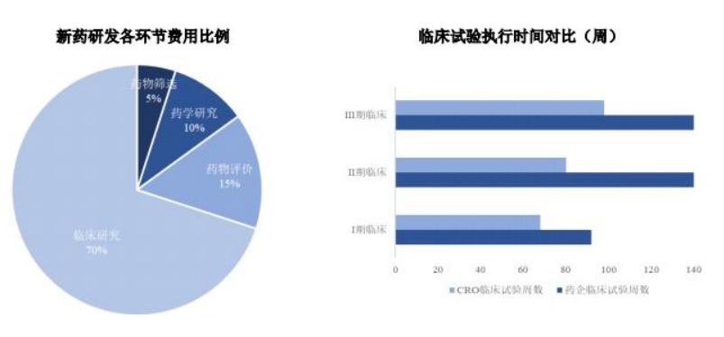 据了解,作为创新药行业的卖铲人和独立的第三方研究机构,CRO企业能够帮助药企缩短研发周期,降低研发成本,提高研发成功率。思瀚产业研究院的研究结果显示,在Ⅰ-Ⅲ期临床试验阶段,CRO公司整体用时可节省34%,同时节省30-50%的成本。对于药企来讲,把研发外包给CRO公司具有巨大吸引力。