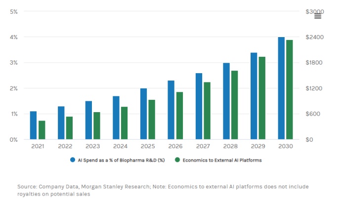 摩根士丹利在一份报告中预估,在未来10年,AI在早期药物开发中的应用可能会转化为50种新疗法,销售额超过500亿美元。该行分析师Matthew Harrison和Vikram Purohit表示,AI制药商与大型药企的合作将帮助改善研发成本。