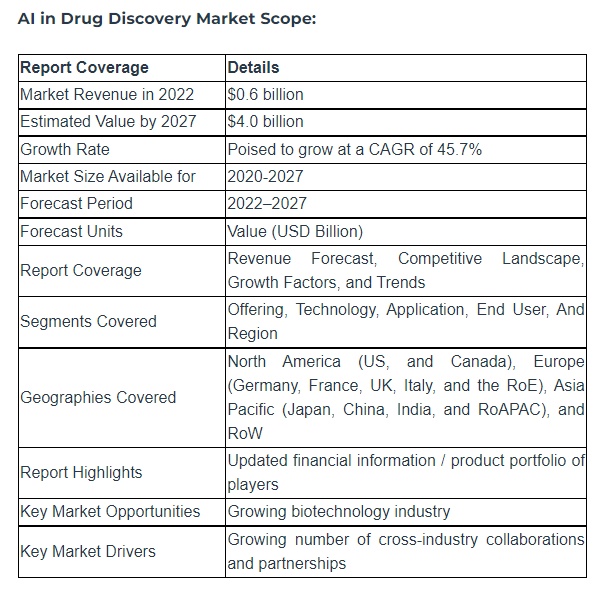 根据MarketsandMarkets™发布的最新报告,2022年全球AI在药物发现市场的营收价值为6亿美元,到2027年有望达到40亿美元,2022年至2027年的复合年增长率为45.7%。遏制药物发现成本和减少这一过程所需总时间的需求日益增长,基于云的应用和服务的采用率不断上升,以及重磅药物的专利即将到期,这些都是推动该市场增长的一些关键因素。