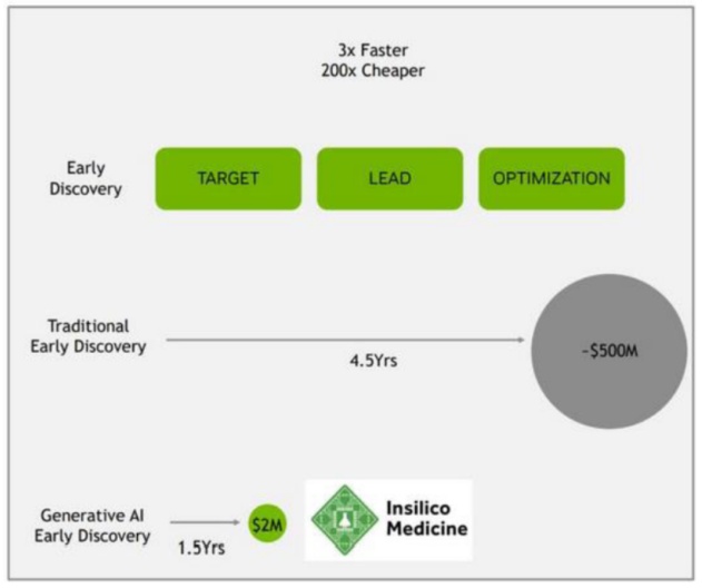 AI之于生物医药行业的意义在于,对一般的生物医药企业来说,开发一个创新药的完整周期平均需要至少10年,而临床试验阶段平均需要6-7年的时间。相比传统新药发现,AI凭借机器学习(ML)、图像识别等独特优势可以提供更好的预测模型和更高的命中率,以缩短新药发现时间,节省成本提高净收入。根据英伟达公开资料,使用AI技术可使药物早期发现所需时间缩短1/3。