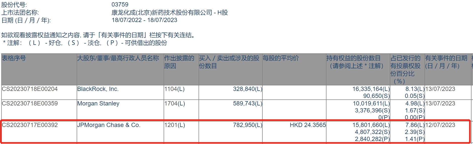 智通财经APP获悉,香港联交所最新资料显示,7月12日,小摩减持康龙化成(03759)78.2950万股,每股作价24.3565港元,总金额约为1906.99万港元。减持后最新持股数目约为1580.17万股,最新持股比例为7.86%。
