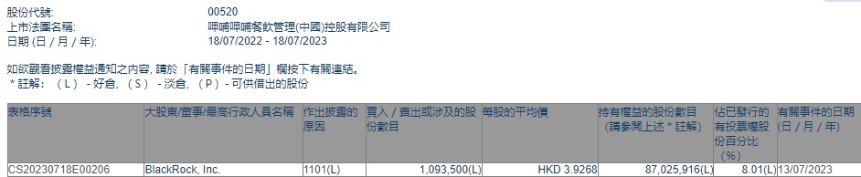 智通财经APP获悉,根据香港联交所资料显示,7月13日,贝莱德增持呷哺呷哺(00520)109.35万股,每股作价3.9268港元,总值约429.40万港元。最新持股数目约8702.59万股,最新持股比例为8.01%。