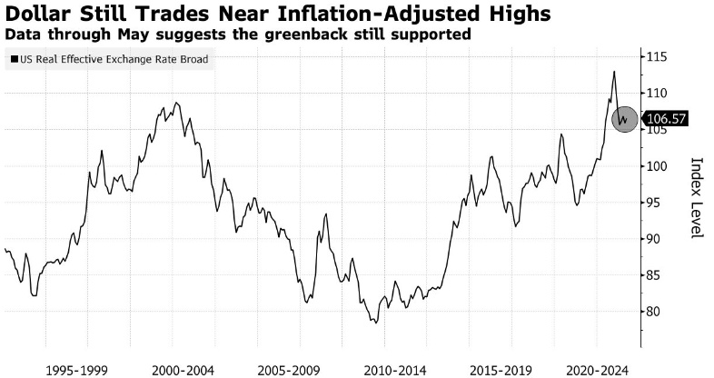 与此同时,根据国际清算银行的最新数据,截至5月份,经通胀调整后的美元汇率接近历史高位。值得注意的是,7月份美元被大幅抛售,彭博美元指数上周下跌近2%,至2022年4月的低点。