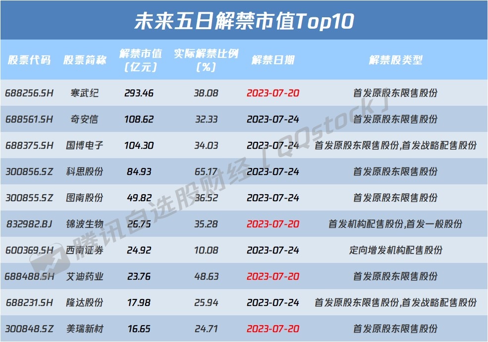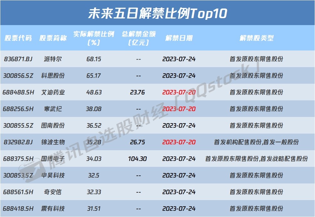从解禁比例来看,未来五日派特尔实际解禁比例达68.15%,其次解禁比例居前的分别为科思股份和艾迪药业;从解禁市值来看寒武纪、奇安信、国博电子等股解禁市值居前。