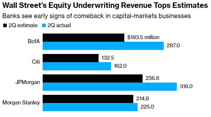 在一年多的投行交易低迷之后,华尔街巨头们终于看到了资本市场业务的复苏迹象。美国银行(BAC.US)、摩根士丹利(MS.US)、摩根大通(JPM.US)和花旗集团(C.US)第二季度的股票承销收入都超出了分析师的预期,除花旗(C.US)外,其他四家公司的股票承销收入都高于上年同期。各大银行(花旗除外)的债务承销业务也都超出了预期。