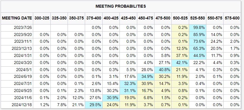 经济学家和金融市场交易员似乎与美联储仍有些许分歧。美联储政策制定机构联邦公开市场委员会成员的最新“点阵图”预测显示,基准隔夜利率将在5.50%-5.75%见顶,但在路透调查的106位经济学家中,只有19位预测利率将达到这一区间。而根据CME“美联储观察工具”,市场普遍预计美联储将在7月份加息后便暂停加息。
