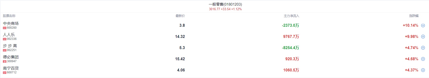 零售股继续活跃,中央商场4连板,人人乐涨停,步步高、友好集团、红旗连锁、中兴商业等拉升。