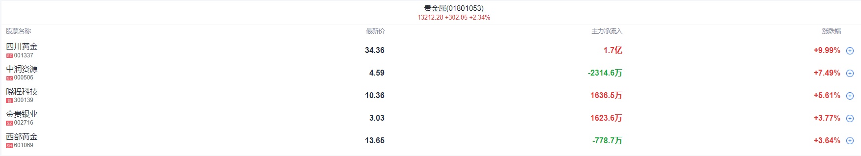 黄金等贵金属板块走强,四川黄金大涨6%,西部黄金、潮宏基、中润资源、盛达资源、老凤祥、银泰黄金等冲高。