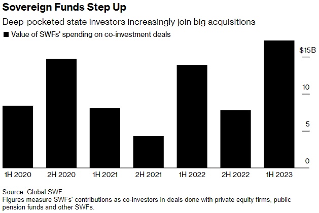 最近几周,KKR(KKR.US)、殷拓集团(EQT AB)和布鲁克菲尔德(BAM.US)都转向富裕的波斯湾国家,为大额交易取得了大量资金。数据提供商Global SWF的数据显示,今年上半年,主权财富基金在这类共同投资上的支出达到创纪录的172亿美元,较去年同期增长24%。