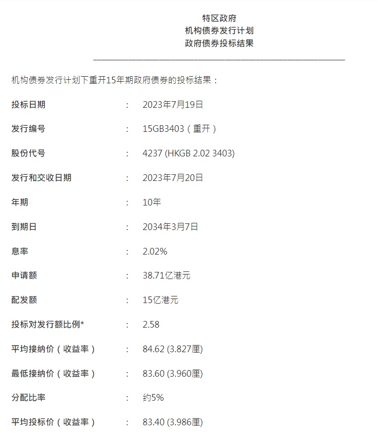 智通财经APP获悉,7月19日,香港金融管理局代表香港特别行政区政府,宣布在机构债券发行计划下,推出总值15亿港元的10年期政府债券,债券的投标申请总额达38.71亿港元。投标对发行额比例(即债券的投标申请总额对债券的发行总额的比例)为2.58。平均接纳价是84.62,即以年率计的收益率为3.827%。