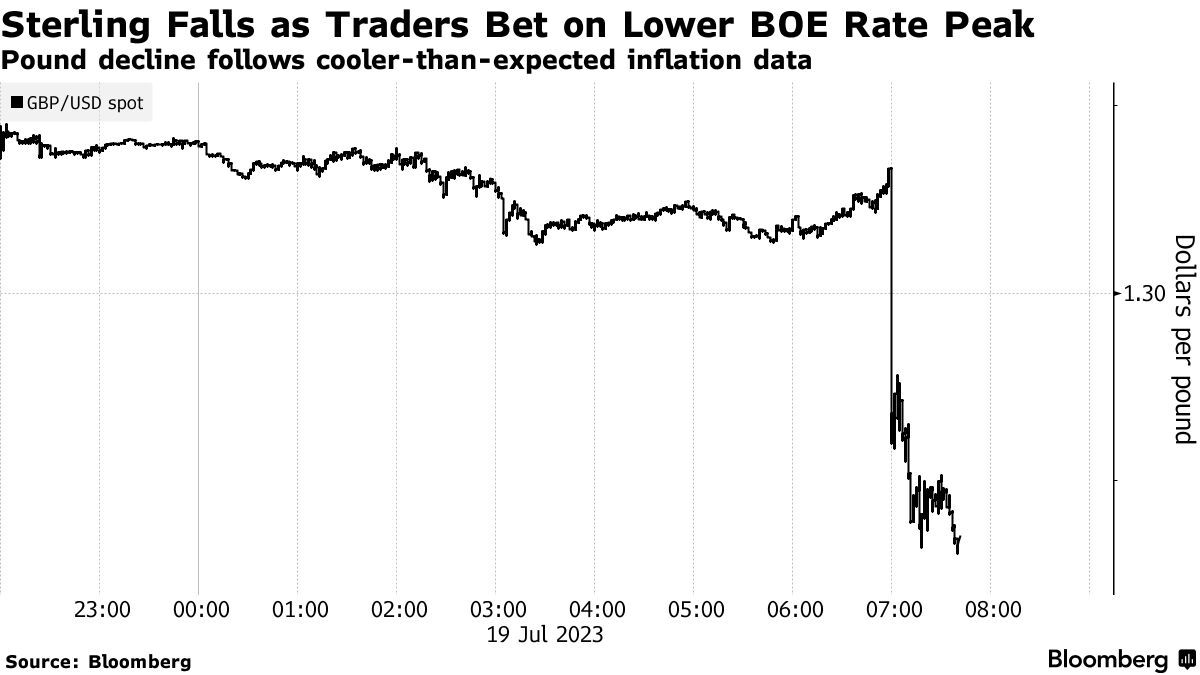 数据公布后,由于外汇交易员减少了对英国央行进一步加息的押注,英镑跌幅扩大。债券市场目前预计,英国基准利率将在6%以下见顶,低于本月早些时候甚至曾预计的6.5%这一历史高点。