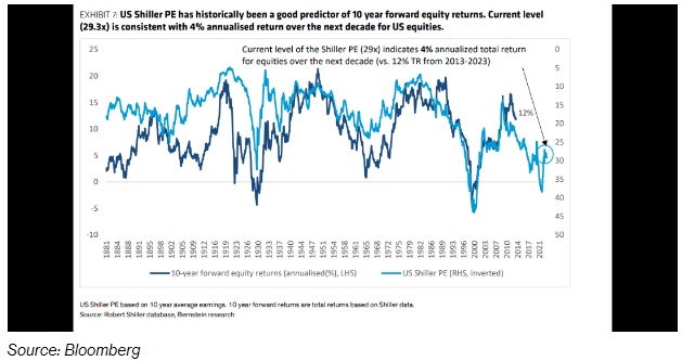 他们的预测基于一项估值指标:经长期周期调整后的市盈率,即席勒市盈率。策略师们表示,截至6月份,该指数为29.3,处于第94个百分位。较高的读数通常等同于较低的长期股票回报。