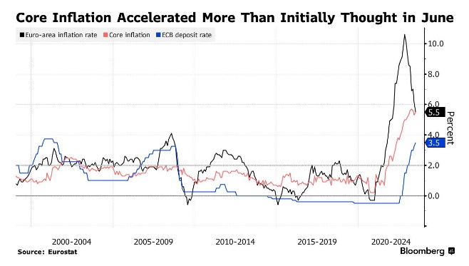 Bloomberg Economics欧元区经济学家Maeva Cousin表示:“我们预计,整个夏季的核心通胀将主导这场辩论,并推动欧洲央行在9月进行最后一次加息,将最终利率上调至4%。核心通胀率小幅上修至5.5%说明了这种紧张局势。”