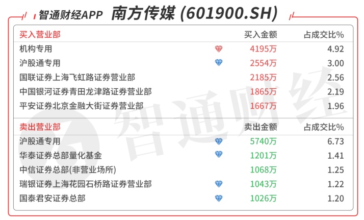 南方传媒(601900.SH):多主力现身龙虎榜,机构席位买入4195万元,沪股通对倒卖出3186万元,当日净买入2387万元,该股今日底部反包首板,预计压力位在30日线附近。