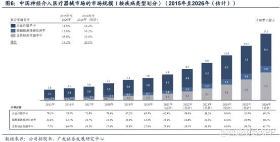 国产市场渗透率低,加上国内老龄化日益严重,国内的神经介入医疗器械市场大有可为。统计数据显示,中国神经介入医疗器械市场的市场规模由2015年的28亿元增加至2020年的58亿元,复合年增长率为16.2%,并预期于2026年进一步增加至175亿元,2020年至2026年的复合年增长率为20.1%。其中,出血性脑卒中医疗器械为中国市场规模最大的子市场,占2020年中国神经介入医疗器械市场规模的65.5%。同时,该细分市场在接下来几年内也保持着最高的市场规模增长率,急性缺血性脑卒中紧随其后。