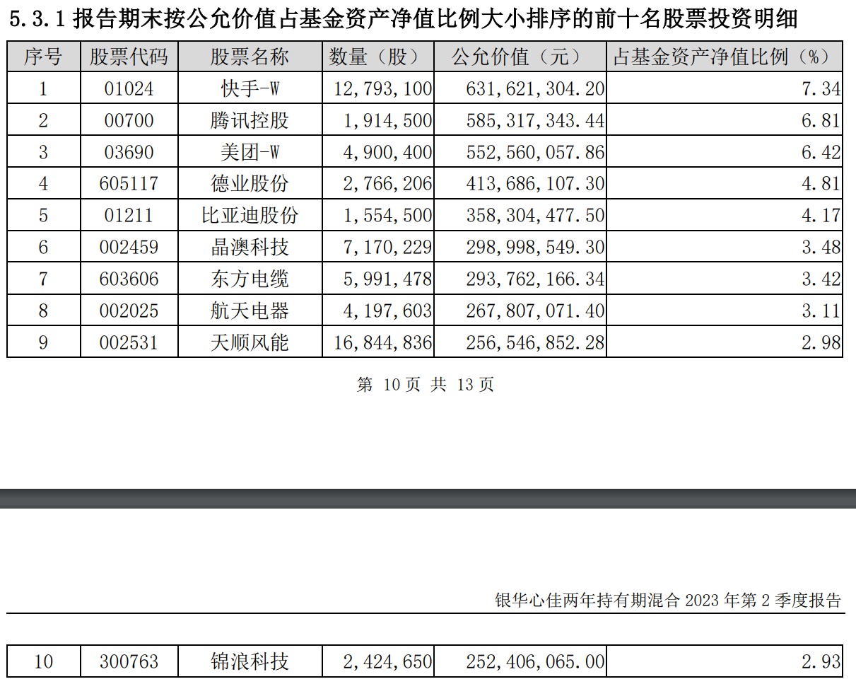 具体来看,银华心佳两年持有期2023年二季报的前十大重仓股依次是:快手-W(01024)、腾讯控股(00700)、美团-W(03690)、德业股份(605117.SH)、比亚迪股份(01211)、晶澳科技(002459.SZ)、东方电缆(603606.SH)、航天电器(002025.SZ)、天顺风能(002531.SZ)、锦浪科技(300763.SZ)。