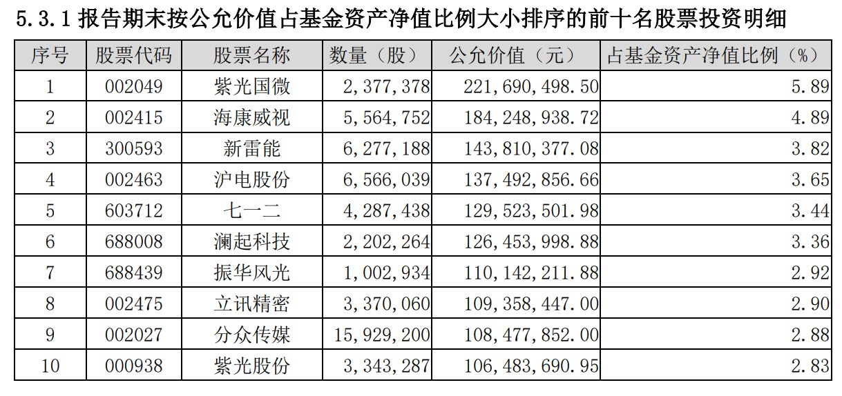 具体来看,银华中小盘二季度末权益仓位为86.44%,较一季度末的87.27%略有下降。其前十大重仓股依次为:紫光国微(002049.SZ)、海康威视(002415.SZ)、新雷能(300593.SZ)、沪电股份(002463.SZ)、七一二(603712.SH)、澜起科技(688008.SH)、振华风光(688439.SH)、立讯精密(002475.SZ)、分众传媒(002027.SZ)、紫光股份(000938.SZ)。