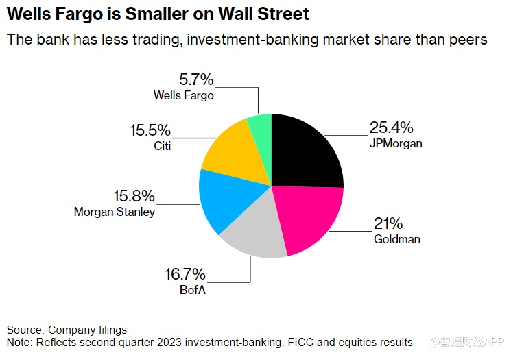 与一年前的4%相比,富国银行在第二季度的资本市场收入份额有所增长。该行还有更大的增长空间,其赚取的19亿美元的投资银行和交易收入只是竞争对手的一小部分。作为最大的华尔街银行,摩根大通赚取了86亿美元。