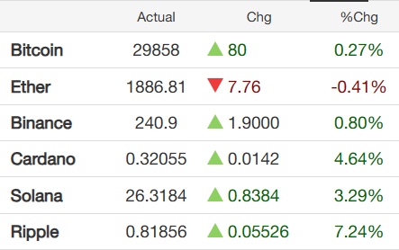 智通财经APP获悉,周三,加密货币市场表现有所分化。截至发稿,市值最大的比特币微涨0.27%,徘徊在3万美元左右;以太坊则跌0.41%。另一方面,规模较小、知名度较低的一些加密货币实现反弹,Cardano(艾达币,ADA)涨4.64%,Solana(SOL币)涨3.29%,Ripple(瑞波币,XRP)更是涨超7%。