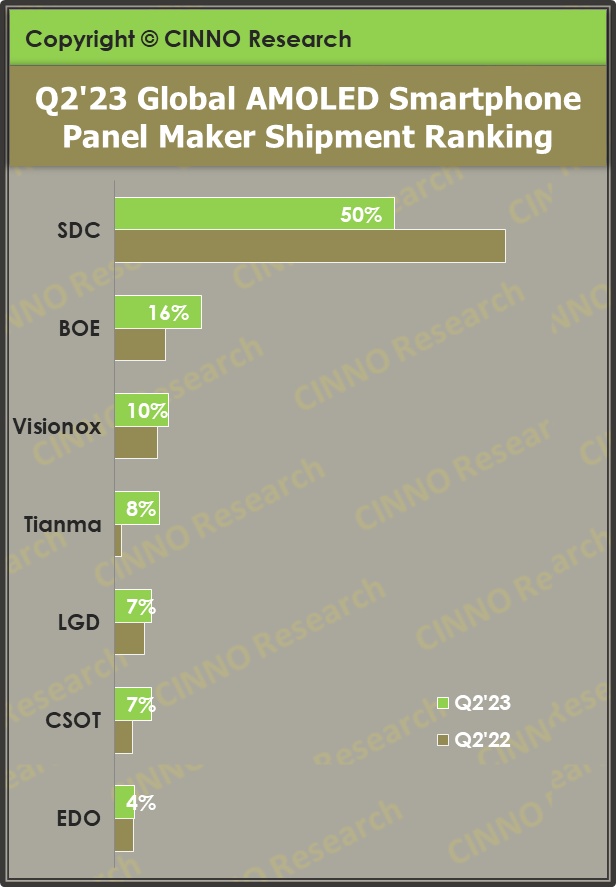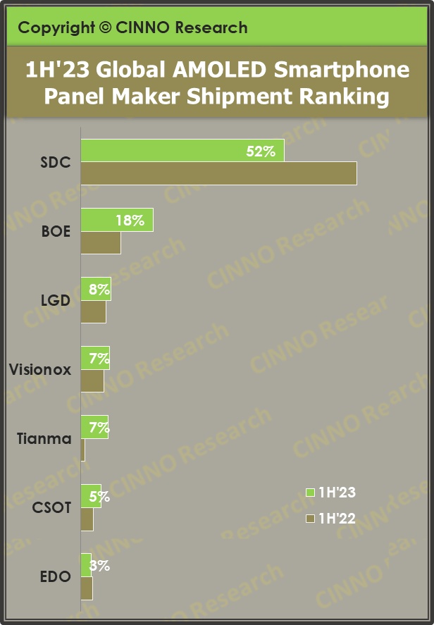 从市场格局来看,2023年第二季度,三星显示(SDC)AMOLED智能手机面板出货量同比下滑19.3%,环比下滑1.4%,市场份额首次跌破50%,为49.9%,主要因越来越多品牌的订单量持续由三星显示转向国产AMOLED面板;京东方(BOE)AMOLED智能手机面板出货量同比增长92.2%,环比下滑23.3%,市场份额15.5%,同比上升6.4个百分点,作为国内面板领军企业,其出货量优势显著;维信诺(Visionox)AMOLED智能手机面板出货量同比增长41.2%,环比大幅增长101.5%,市场份额9.6%,同比上升1.9个百分点,位居全球第三,国内第二,得益于其与华为、荣耀等头部品牌客户的深度合作,维信诺订单量稳定;天马(Tianma)AMOLED智能手机面板出货量同比大幅增长570.6%,环比增长46.2%,市场份额8.0%,同比上升6.7个百分点,出货量及市场份额均增长最大,超越乐金显示(LGD)位居全球第四、国内第三,主要得益于其国内主流品牌客户的全覆盖及厦门G6柔性AMOLED产线稼动率的持续攀升,其订单量保持高位。