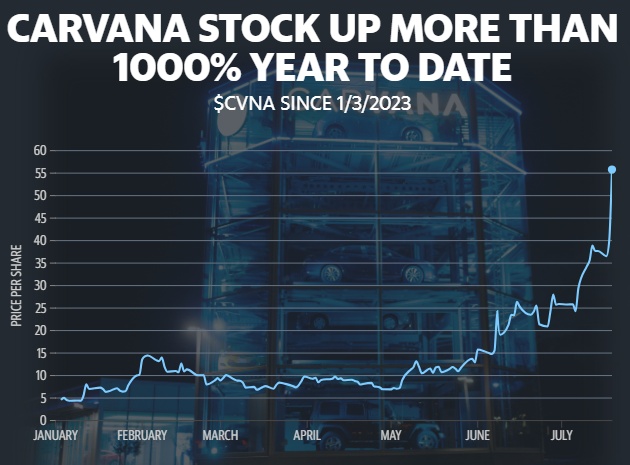 周三,该公司宣布与债券持有人达成债务重组协议,并公布了优于预期的业绩。Carvana第二季度销售额同比下降23.6%,至29.7亿美元,超过市场预期的25.9亿美元;Q2每股亏损0.55美元,市场预期每股亏损1.15美元。随后该股周三上涨40%,收于55.80美元。在2022年底的低点,Carvana股价低于4美元。