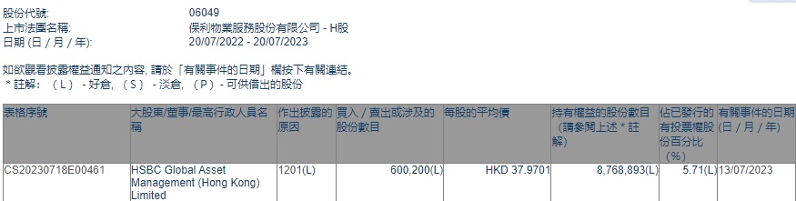 智通财经APP获悉,香港联交所最新资料显示,7月13日,HSBC Global Asset Management (Hong Kong) Limited减持保利物业(06049)60.02万股,每股作价37.9701港元,总金额约为2278.97万港元。减持后最新持股数目约为876.89万股,最新持股比例为5.71%。