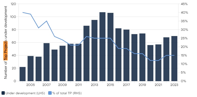 问:“Top Projects”研究报告列举了70个正在开发的大型项目,这与近年来相比有了很大的增长,但仍低于投资下降前的峰值。你能正确看待这件事吗?