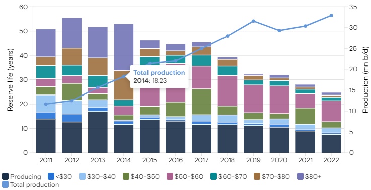 答:成本曲线不断收缩和变陡,这意味着需要更高的油价来平衡市场。如果我们使用与去年相同的资金成本,价格将是每桶100美元。然而,我们认为,新开发项目的行业资本成本在过去一年有所放缓。我们现在假设的门槛利率是15%,因为在俄乌冲突之后,该行业已经接受了需要更多石油和天然气投资的事实。因此,我们需要每桶80美元的油价来长期平衡市场。
