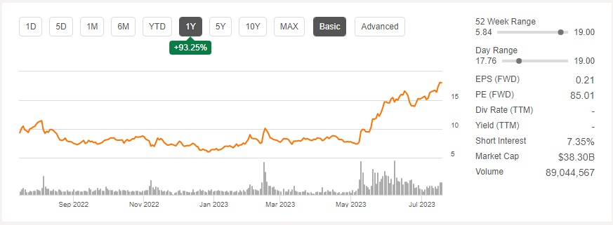 智通财经APP获悉,近段时间以来,在人工智能(AI)热潮的带动下,Palantir(PLTR.US)股价持续上涨,周四盘中一度创下52周新高。今年上半年,该股累计上涨185%,相比之下,纳斯达克综合指数上涨近39%。然而,该股仍远低于2021年1月底创下的历史盘中高点45美元。