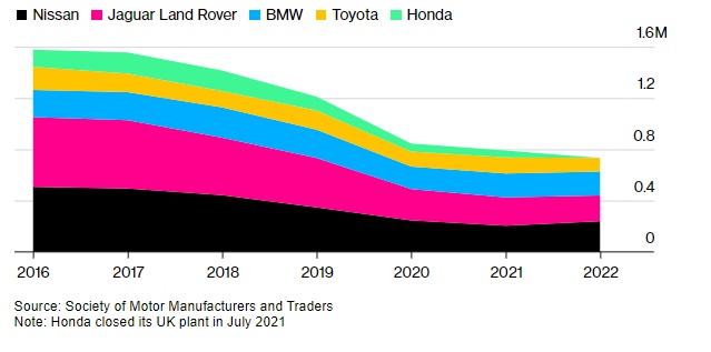 据了解,自2016年以来,顶级制造商的产量大幅下滑。尤其在英国脱欧后,英国与欧盟的关系使重振英国汽车业的努力变得复杂。欧盟是英国制造汽车的最大单一目的地,占2022年英国国内汽车出口的58%。
