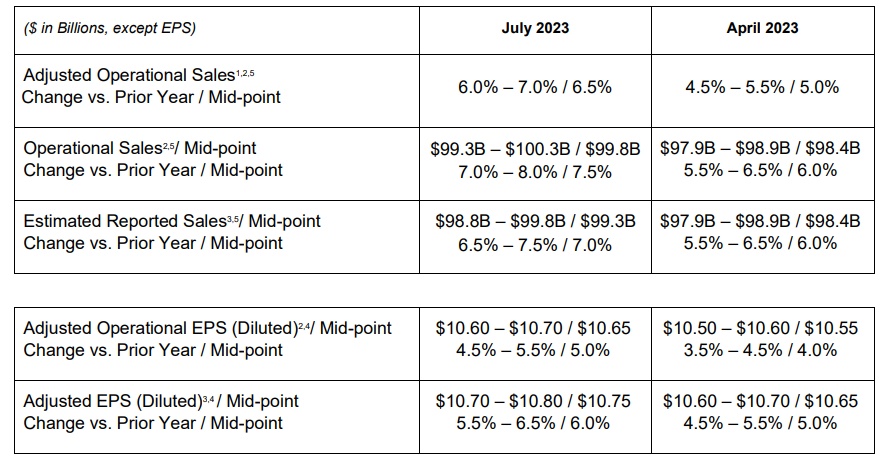 市场聚焦的全年业绩预期方面,强生目前预计全年的总体销售额区间为988亿美元——998亿美元,区间较4月时的预期高出约10亿美元;该公司将2023年调整后的每股收益预期从此前的10.60美元到10.70美元上调至10.70美元——10.80美元。