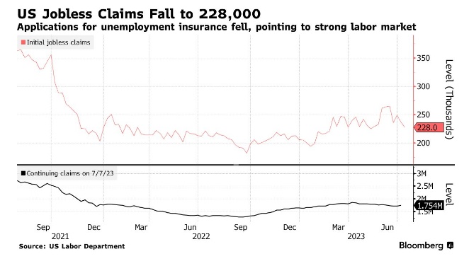 智通财经APP获悉,美国上周初请失业金人数降至两个月来的最低水平,这表明在就业增长放缓之际,企业对员工的需求仍显韧性。美国劳工部周四公布的数据显示,截至7月15日当周初请失业金人数为22.8万,较前一周减少9000人,低于经济学家普遍预期的24万。截至7月8日当周续请失业金人数增加3.3万,达到175万,这是三个多月来的最大增幅。初请失业金人数四周均值降至23.75万的六周低点。