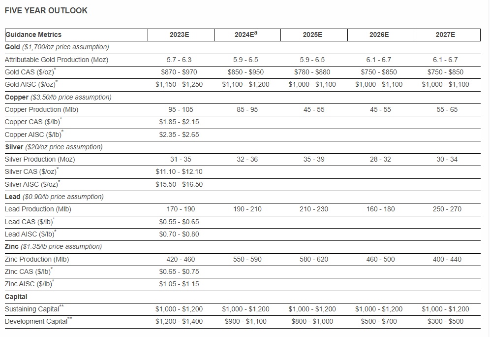 展望2023年全年,该公司预计可归属黄金产量将在570万至630万盎司之间,综合金价维持成本(AISC)在每盎司1150美元至1250美元之间。该公司还给出了未来五年的指引。